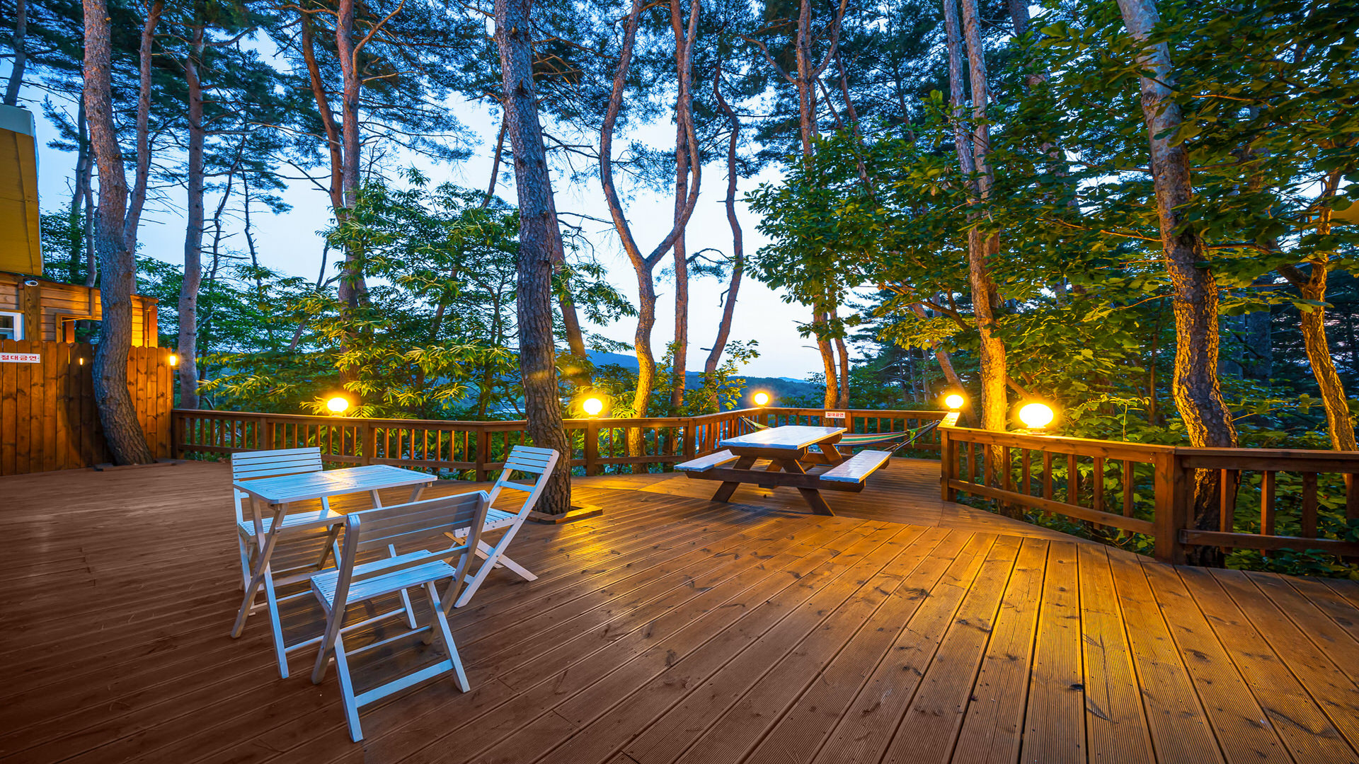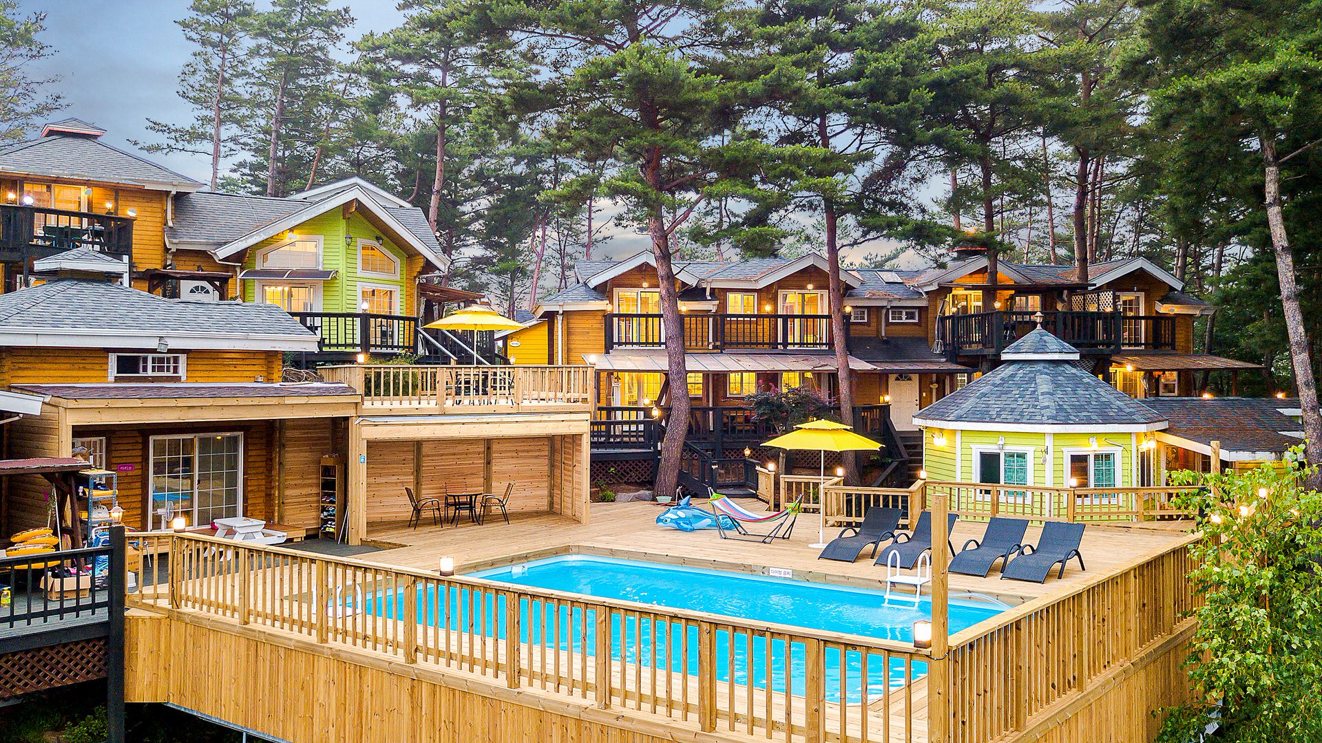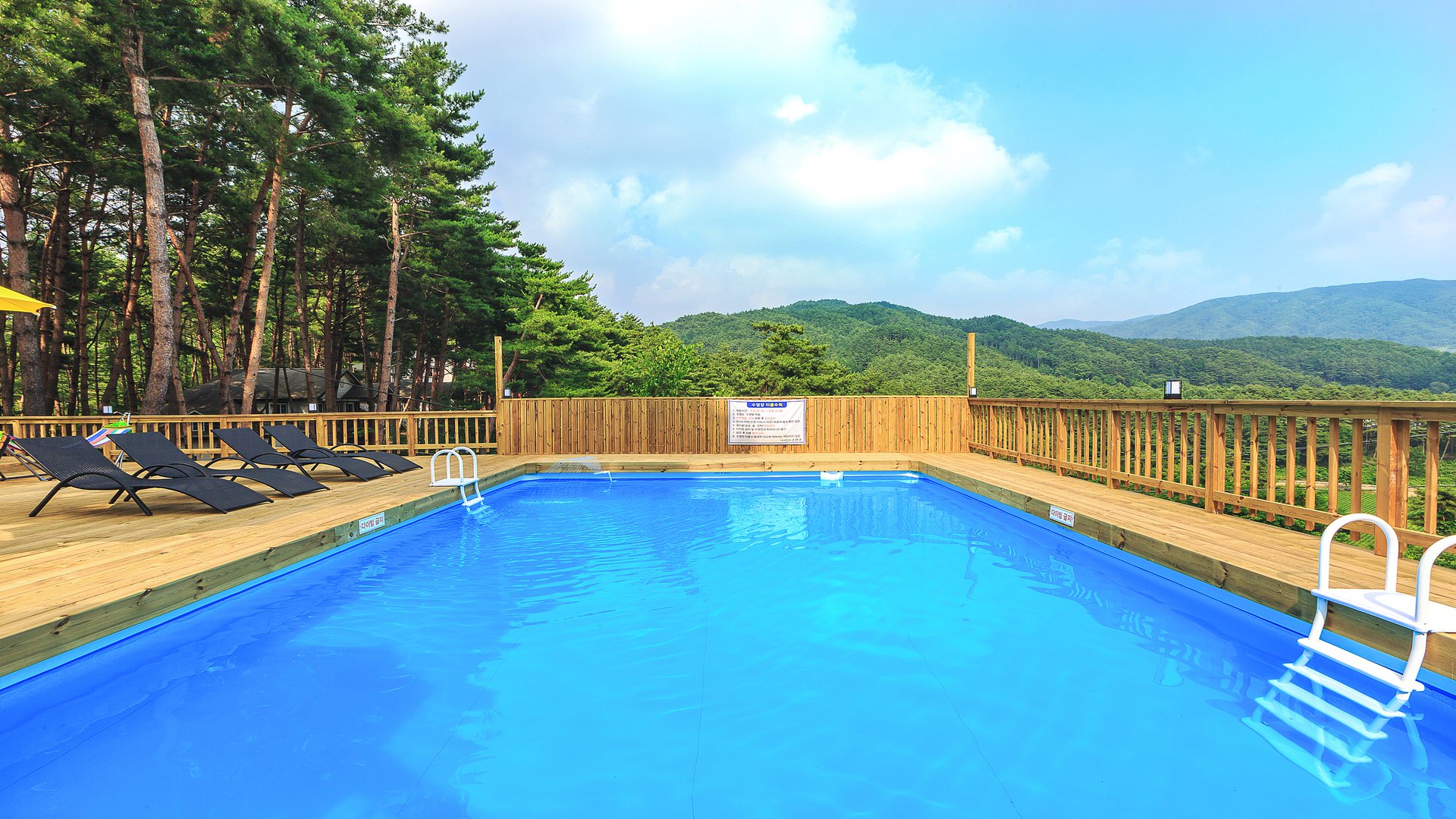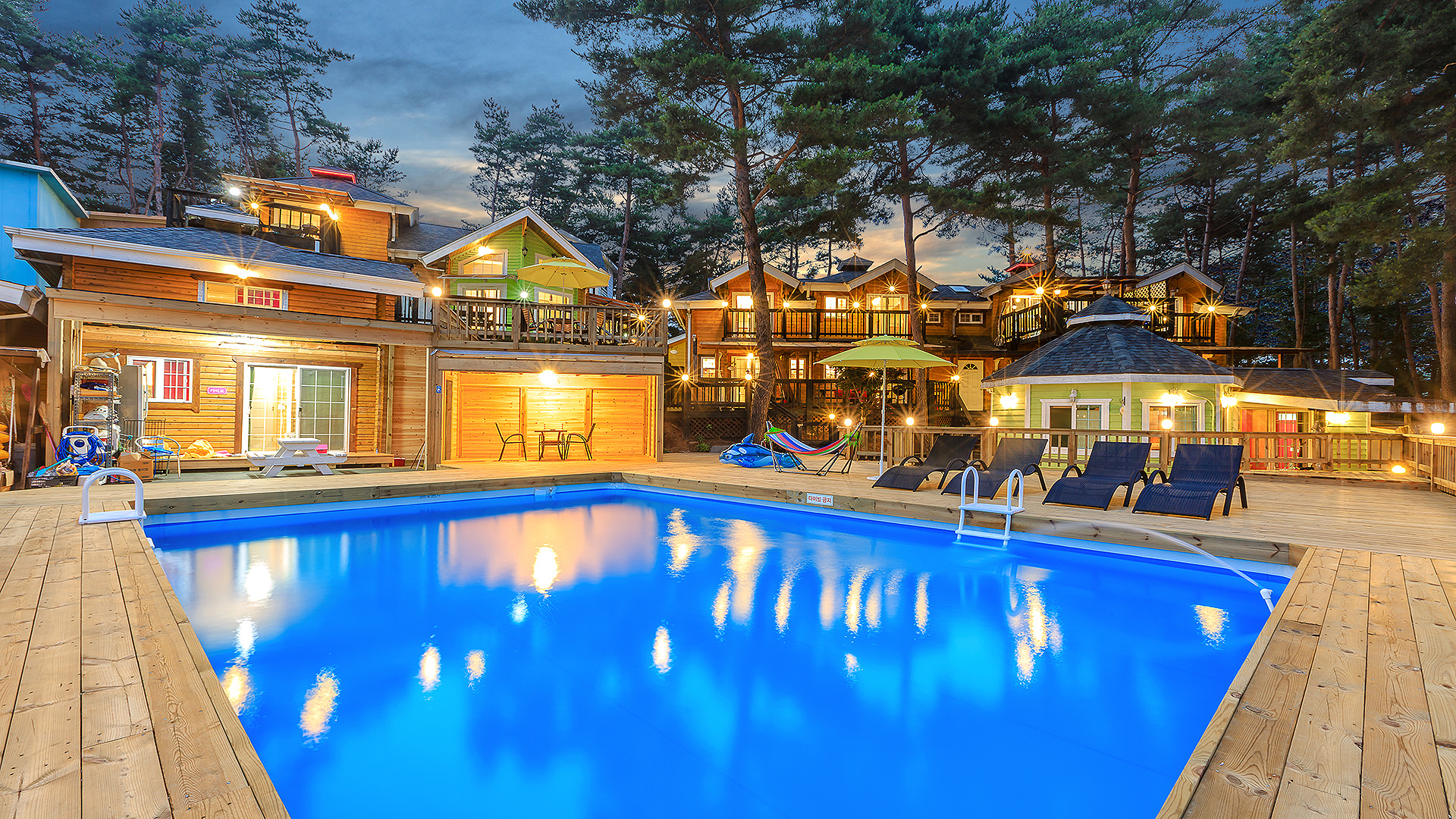 쭈욱쭈욱 뻗은 소나무 숲 속에 수입산 통나무로 지어져 일상에 지친 피로를 풀 수 있는 편안한 휴식이 있는 커플, 가족펜션입니다.